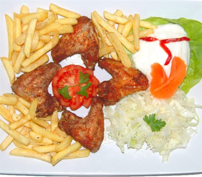 Aripioare de pui, cartofi prajiti, salata si branza