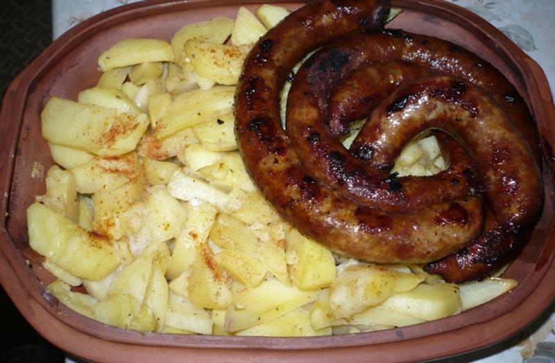 Carnati de porc cu cartofi la tigaie