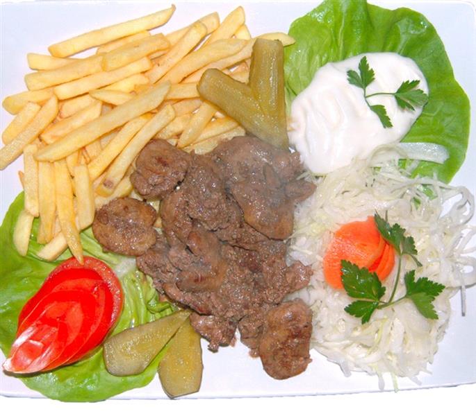 Ficatei la tigaie, cartofi prajiti, smantana si salata