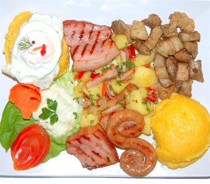Grill mixt de porc, cartofi, ou, mujdei si mamaliguta