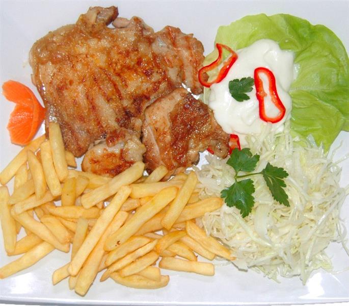Pulpe dezosate, cartofi prajiti, branza si salata
