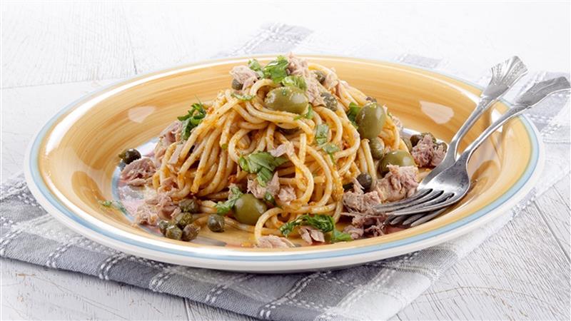 Spaghetti cu tonno si masline verzi